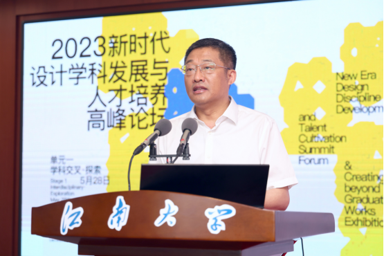 5月28日上午, 2023新时代设计学科发展与人才培养高峰论坛在江南大学图书馆举行。中国工程院院士、江南大学校长陈卫,南京艺术学院校长张凌浩,北京服装学院校长贾荣林,中央美术学院设计学院院长宋协伟,中国美术学院教学督导工作委员会副主任吴小华,湖南大学设计艺术学院院长季铁教授,云南艺术学院副校长陈劲松,中央美术学院教务处处长郝凝辉,我校设计学院党委书记王维青等领导专家,以及兄弟院校师生代表等出席。开幕式由设计学院副院长牛犁主持。